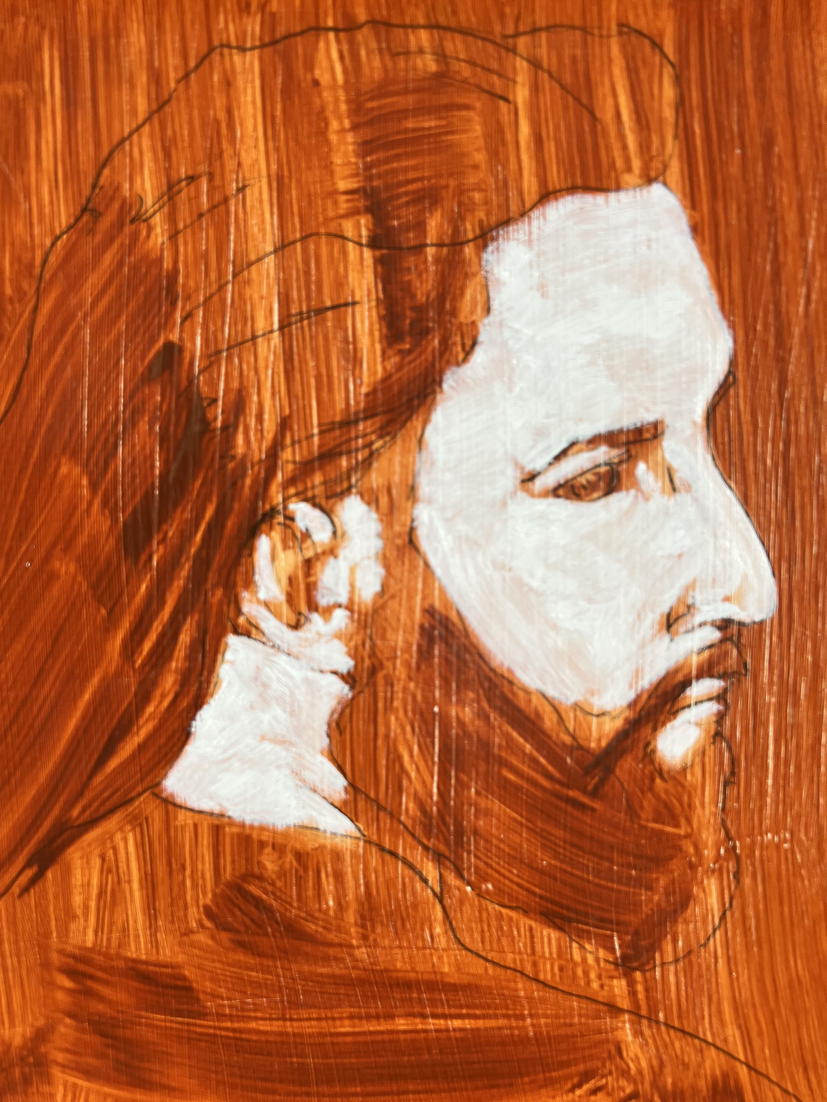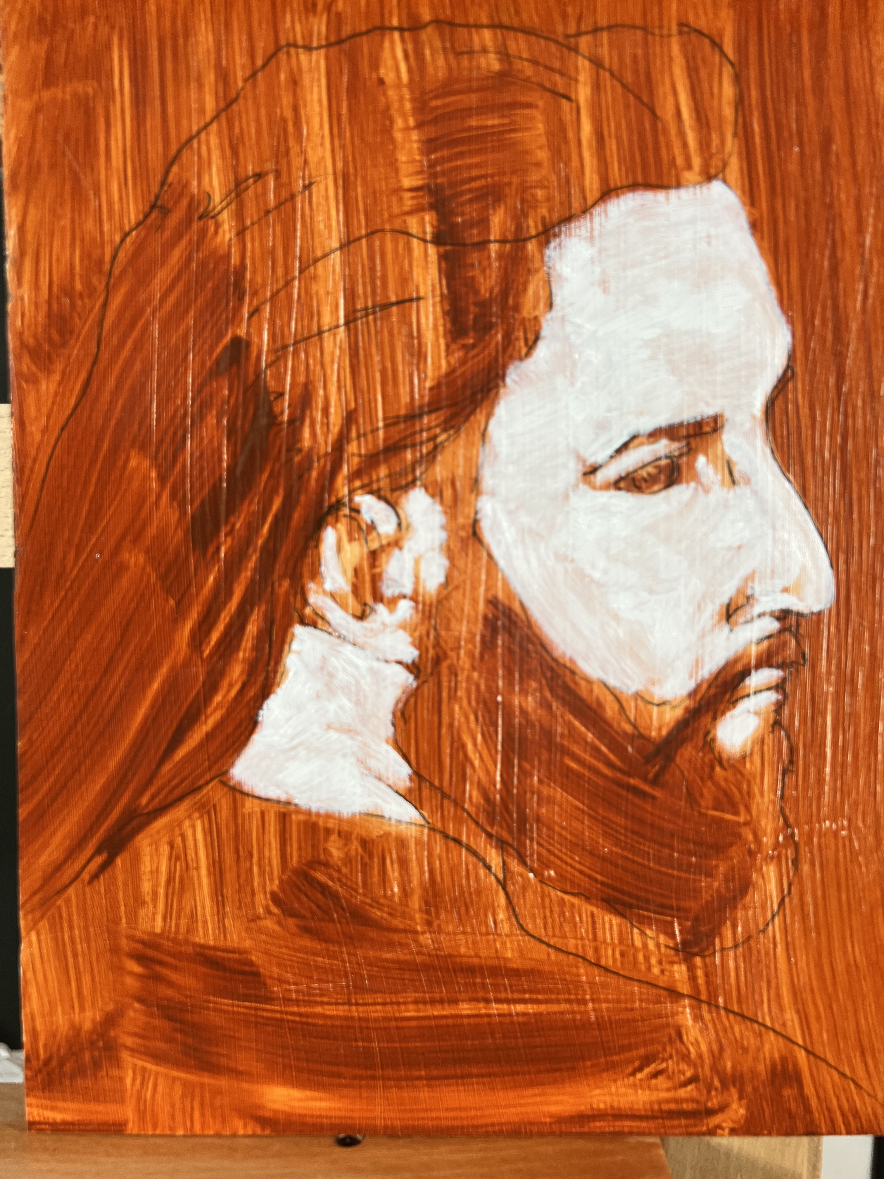 Here’s the underpainting for “St. Mark,” part of a large series of paintings I’m calling Both Old and New: Retrieval in a Rootless Age. This picture shows stage four of a six-part process. After the white paint dries, I’ll layer color over the surface of the painting.
